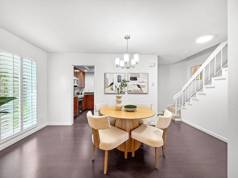Welcome to this well-maintained townhouse-style condominium in a centrally located Mountain View community. This two-story home features a functional layout with laminate flooring throughout the main living areas, a cozy fireplace, and an updated kitchen with quartz countertops, stainless steel appliances, and ample cabinetry. A convenient half bathroom is located on the ground level. Upstairs, two well-proportioned bedrooms offer comfortable living, including a larger bedroom with access to a private balcony overlooking the backyard patio. The full bathroom has been updated with a modern vanity, and the upper-level laundry area adds everyday convenience. The spacious private backyard patio provides a great setting for outdoor dining or relaxation and opens toward the community's landscaped grounds. As an end unit, the home benefits from added privacy and natural light. Additional features include a detached one-car garage, an assigned parking space, and access to Country Village HOA amenities, including a community pool and walking paths. Ideally located near Downtown Mountain View and Castro Street, known for its boutique shops, cafes, and restaurants, this home also offers convenient access to parks, major employers, and key commute routes.