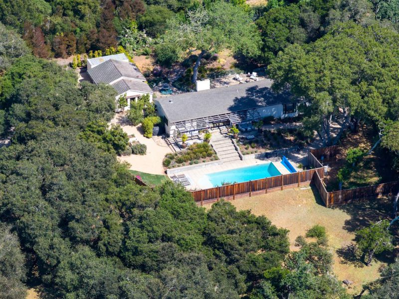 Nestled beneath ancient oaks with sweeping mountain views, this impeccably reimagined California ranch estate offers a rare blend of privacy, beauty, and sophistication. The 2,297 sq ft single-story main residence features soaring vaulted beam ceilings, wide-plank hardwood floors, and walls of glass that open to a stunning pool and gardens. The bright chef's kitchen features quartz countertops, a farmhouse sink, and custom cabinetry. The generous primary suite includes direct garden access, a spa-inspired bath with soaking tub, glass shower, and a custom walk-in dressing room. The main house also features a central air conditioning system! Outside, a string-lit pergola terrace runs the length of the home, terraced steps lead to a sparkling pool framed by lavender and mountain views, and a raised-bed kitchen garden adds charm and function. The detached guest quarters offer flexibility for guests, extended family, or a studio. A stone court with a fountain, mature oaks, and vibrant bougainvillea completes these incredible grounds.