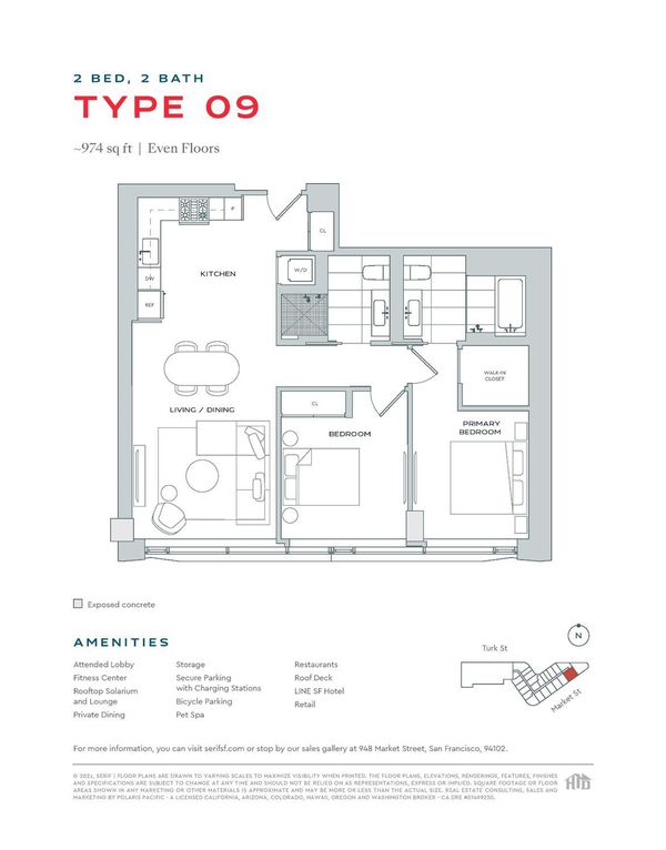 Stunning newly released higher floor spacious 2BR/2BA with luxurious finishes and optional upgrades to make it your own. This remarkable light filled residence overlooking Market Street offers lovely hardwood floors. Full service building with 24 hour concierge, over night security, fitness center, residents' lounge and breathtaking rooftop. Located in the heart of San Francisco's Mid-Market neighborhood, Serif is a new 12-story condominium complex with 242 for-sale residences. Serif also shares its space with the sumptuously hip The LINE hotel, retail and dining experiences. Serif illustrates the revitalization of a rapidly changing section of Market Street. Featuring prime walkable access to the theater, art, retail, dining and nightlife Serif enables residents to be amidst San Francisco's new hub of entertainment. The interior design combines angular forms with raw materials and finishes, such as concrete and wood, the palette blends striking black and white background surfaces with highlights of warm, natural hues and finishes. All images are representative of the development.