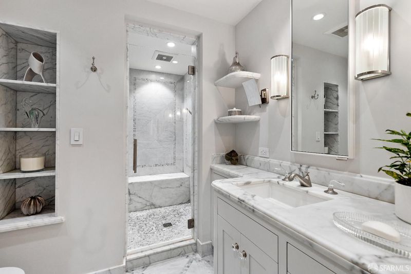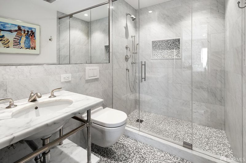 - Marble, Multiple Shower Heads, Shower Stall(s), Stone, Tile