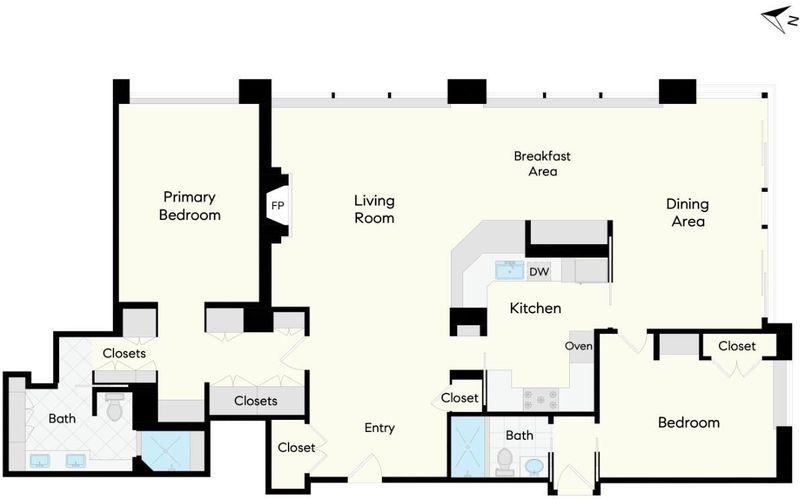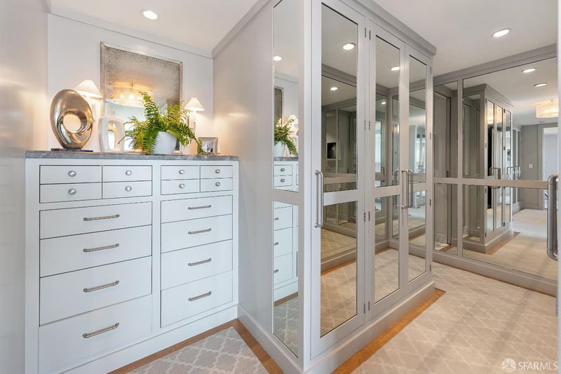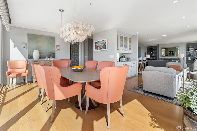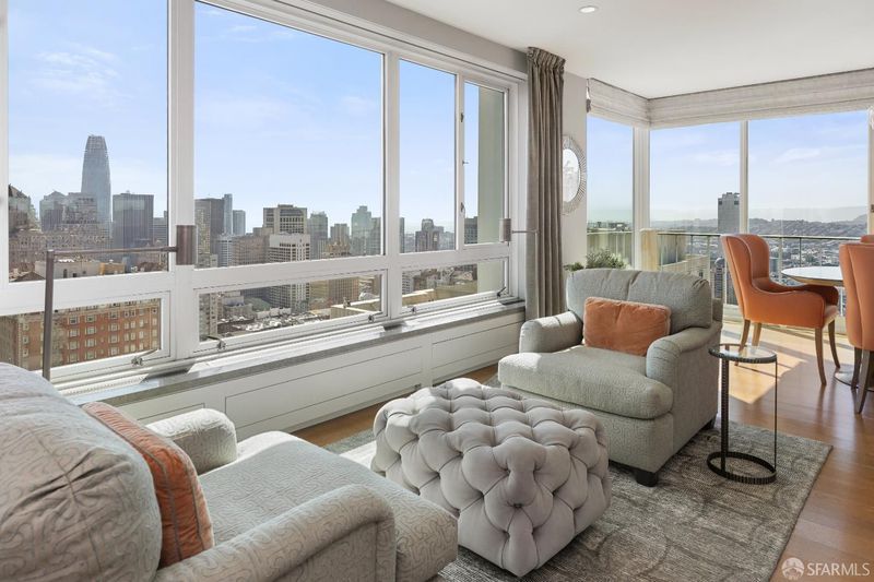 Pairing commanding, panoramic high-floor views of San Francisco's most celebrated landmarks with a timeless classic-contemporary renovation under the creative eye of Chantal Lamberto, this refined, move-in ready apartment is a rare find on Nob Hill. From sunrise to twilight, dynamic outlooks of ever-changing light across the skyline and Bay create a striking yet serene backdrop for daily living and entertaining. An oversized foyer opens to expansive living and dining areas where walls of windows frame sweeping views and fill the space with natural light. The layout flows seamlessly, creating an inviting sense of openness. Wide-plank rift-sawn white oak floors, custom cabinetry, and tailored built-ins lend understated elegance. The living room centers on a fireplace with a honed Grey Jolie marble surround and custom shelving. The dining area sits along the primary view corridor for a dramatic yet refined setting. The open kitchen features Calacatta Nieve countertops, Waterworks backsplash and fixtures, clean-lined cabinetry, and integrated lighting. The primary suite offers downtown views, a mirrored dressing area with abundant closets, and a deluxe bath of rich, statuary marble. The second bedroom includes an ensuite bath, city views, and a separate entrance. Limestone window benches, Holland & Sherry wall coverings, Stark carpeting, and Lutron shades complete the home. Mid-Century 1200 California reigns as one of Nob Hill's most prestigious full-service buildings with a large onsite staff attending to residents' needs. Ideally located near Grace Cathedral, the newly reopened Huntington Hotel, cable cars, and premier restaurants such as the Big Four, the 1200 California setting offers both luxury and convenience.