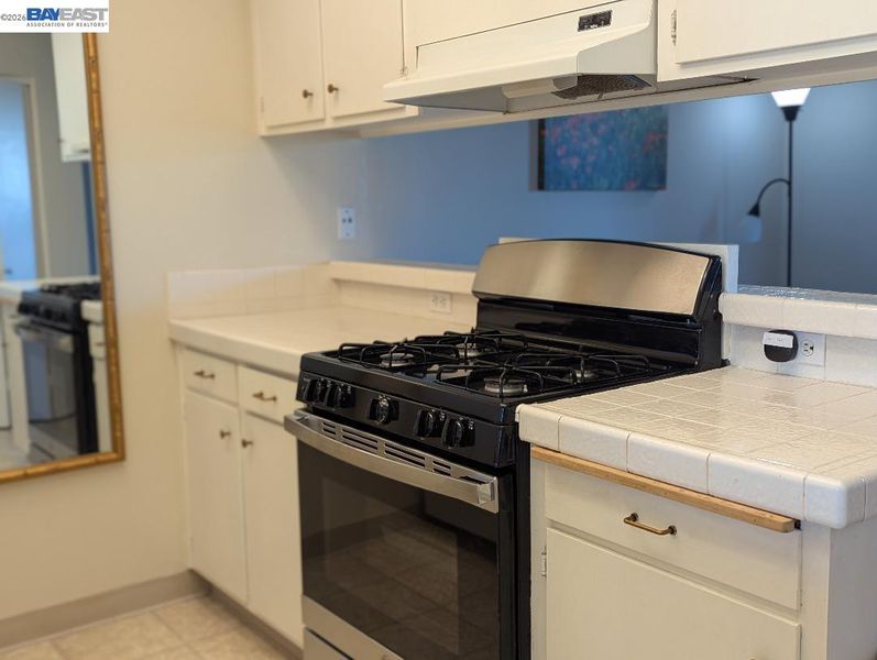 - Dishwasher, Gas Range, Refrigerator, Tile Counters, Disposal, Gas Range/Cooktop, Pantry