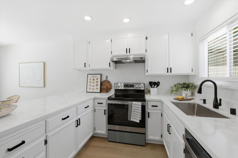 - Countertop - Quartz, Dishwasher, Garbage Disposal, Hood Over Range, Oven Range - Electric, Refrigerator